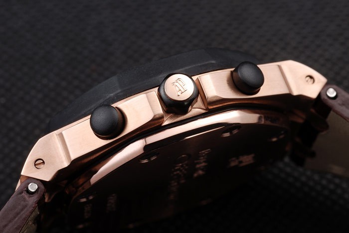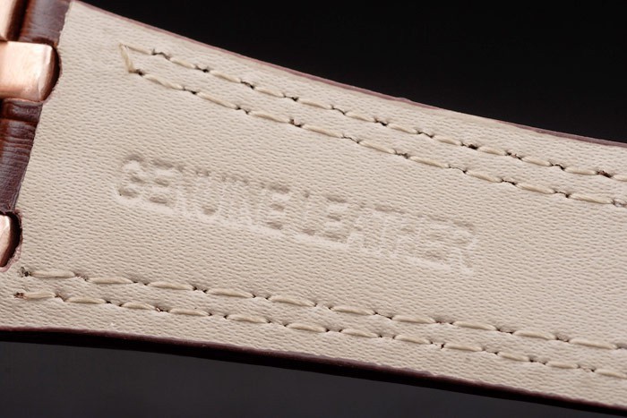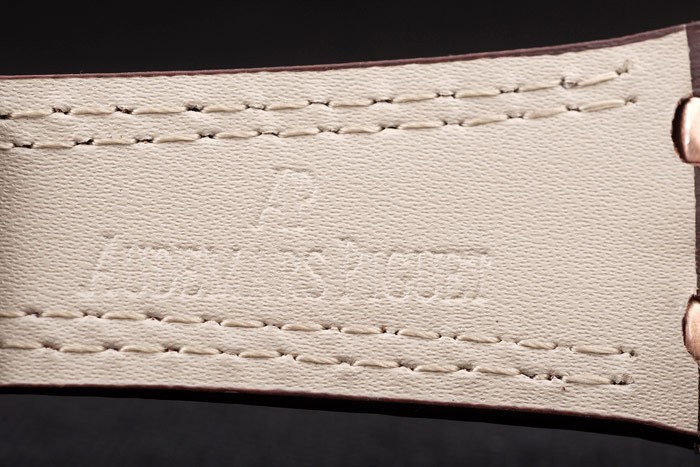 Bracelet: Heat embossed Audemars Piguet dark brown crocodile leather strap with double white stitching and Audemars Piguet engraved rose-gold plated fold-in clasp