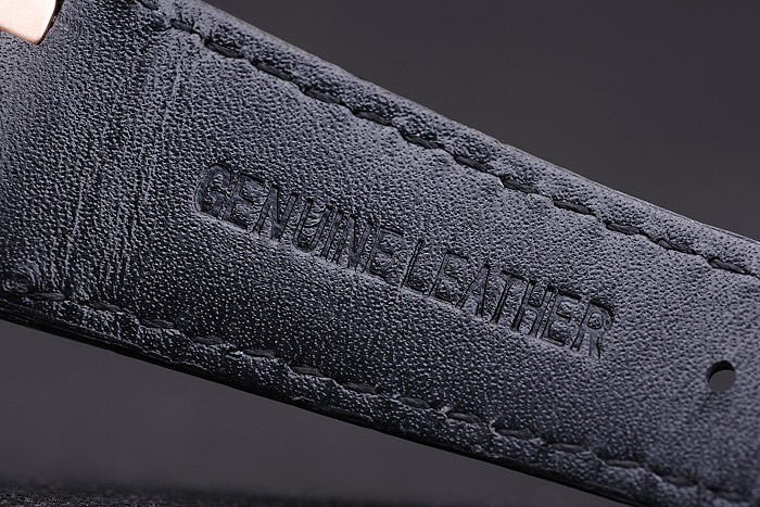 Bracelet: Black crocodile leather strap with white thread stitching and heat embossed Audemars Piguet name and logo and an Audemars Piguet inscribed rose-gold plated flip-over hook clasp