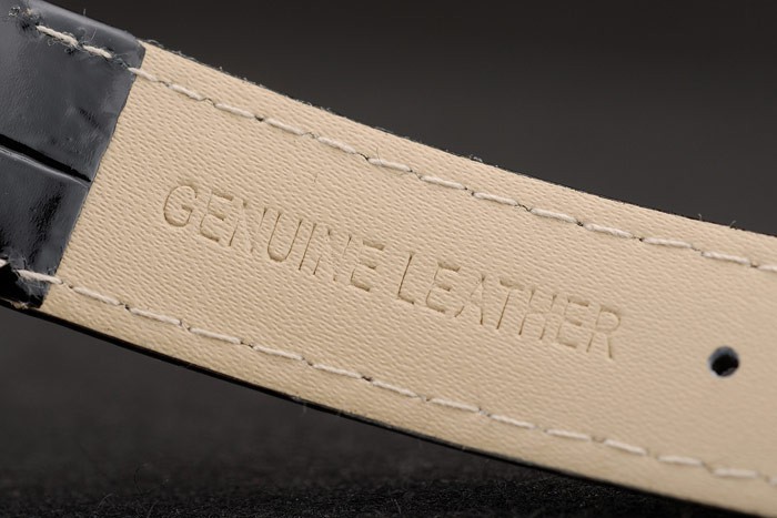 Bracelet: Black crocodile leather strap with heat embossed stamp Chopard and Chopard engraved stainless steel hook-buckle clasp