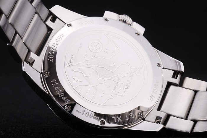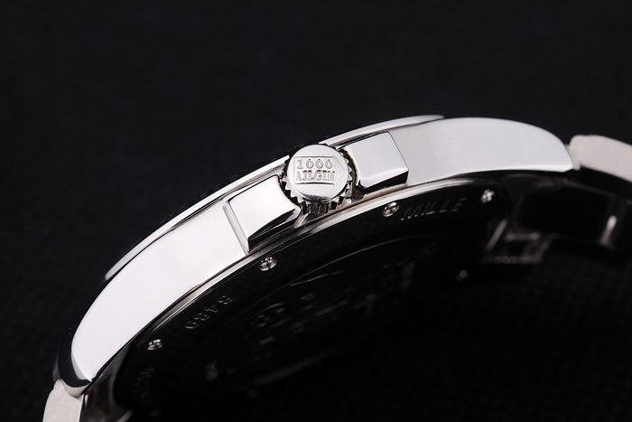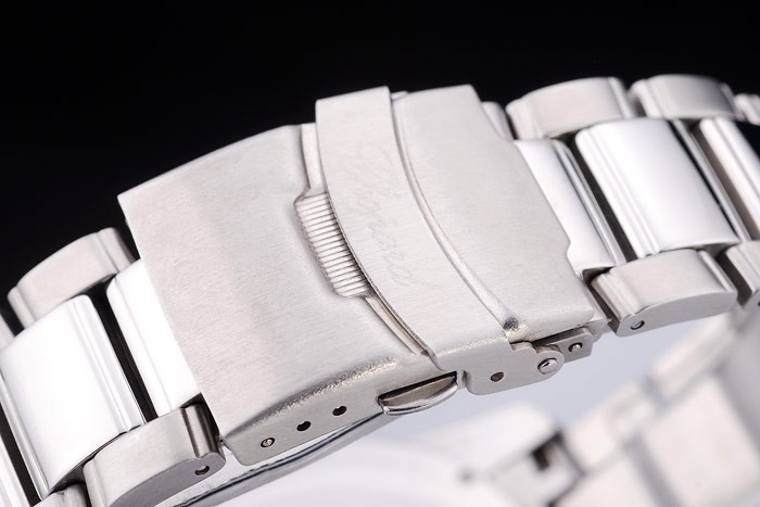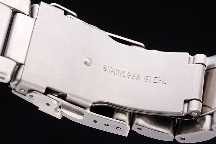 Crown: Polished stainless steel crown engraved with rectangular push-button crowns on either side of it