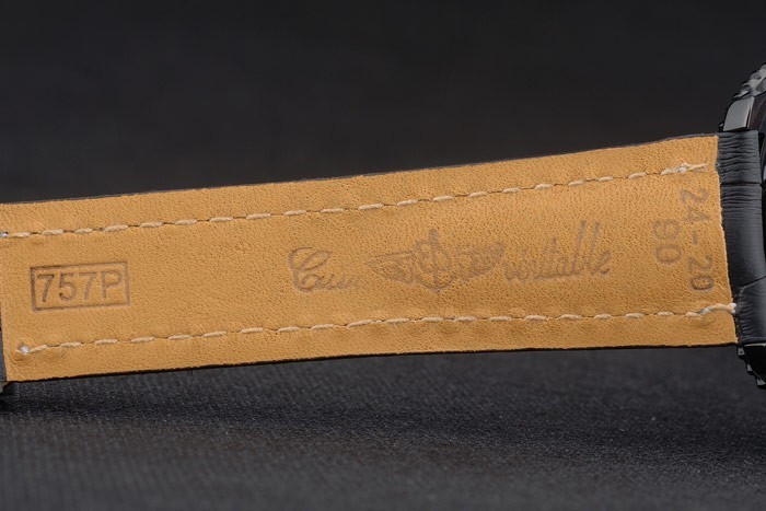 Bracelet: Breitling heat embossed black crocodile leather strap with white thread stitching and logo engraved ion-plated stainless steel fold-in clasp