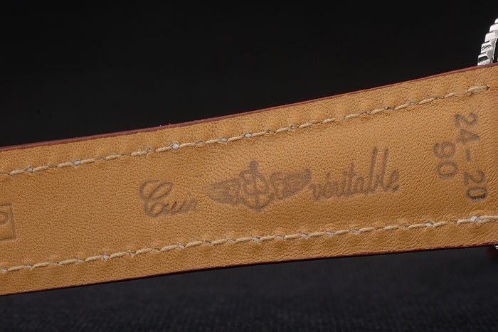 Bracelet: Breitling heat embossed brown crocodile leather strap with white thread stitching and logo engraved polished stainless steel fold-in clasp