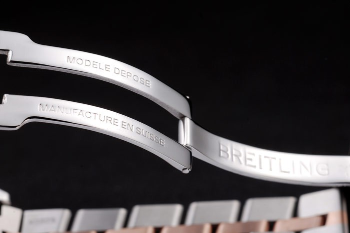 Bracelet: Polished stainless steel and rose-gold link bracelet with date and Breitling engraved fold in clasp