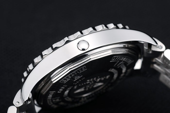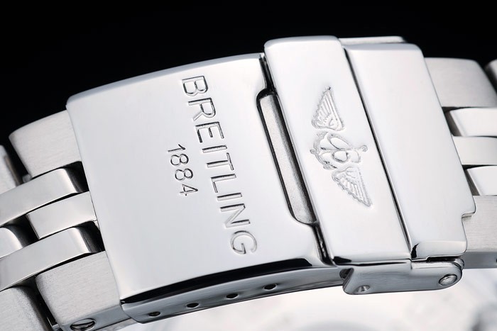 Crown: Polished stainless steel cutwork crown with Breitling logo and two smaller stainless steel push-button crowns on either side of it