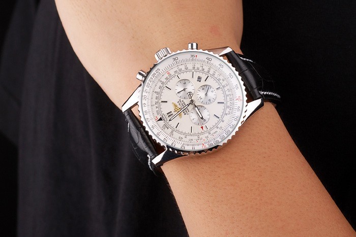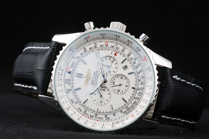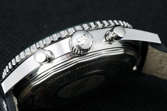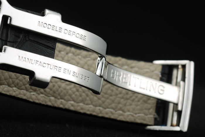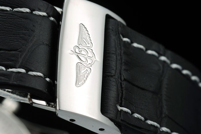 Bracelet: Black crocodile leather strap with patent white stitching and heat embossed Breitling engravings and engraved stainless steel fold in clasp with Breitling logo on top