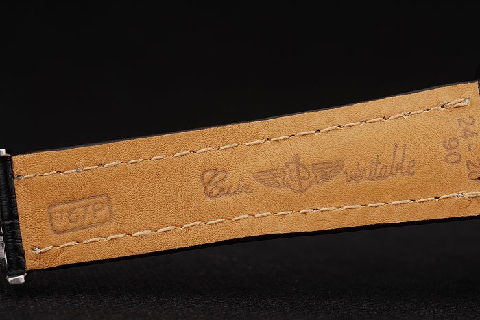 Bracelet: Heat embossed Breitling black crocodile leather strap with white thread stitching and a Breitling logo engraved fold-in stainless clasp