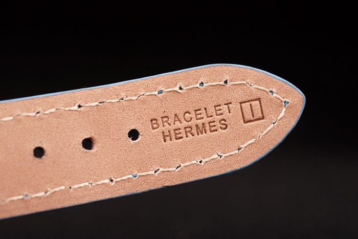 Bracelet: Light blue leather strap with heat embossed stamp Bracelet Hermes and Hermes engraved polished stainless steel hook-buckle