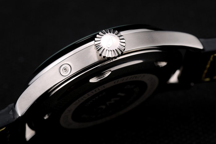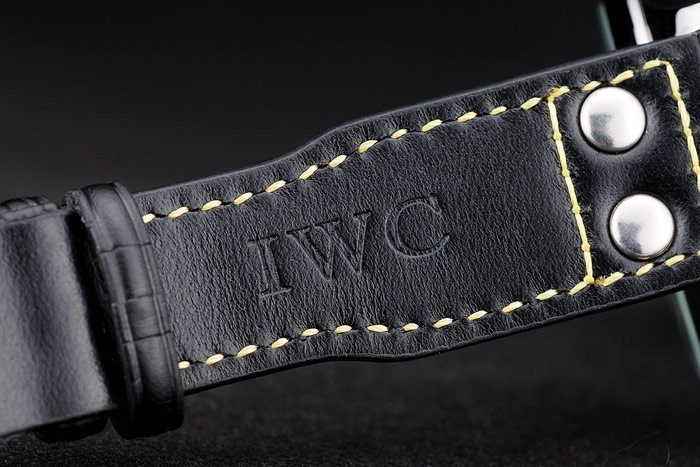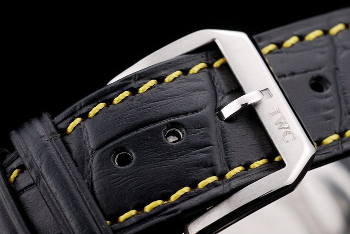 Bracelet: IWC heat embossed black crocodile leather strap with yellow thread stitching and engraved brushed stainless steel hook-IWC clasp