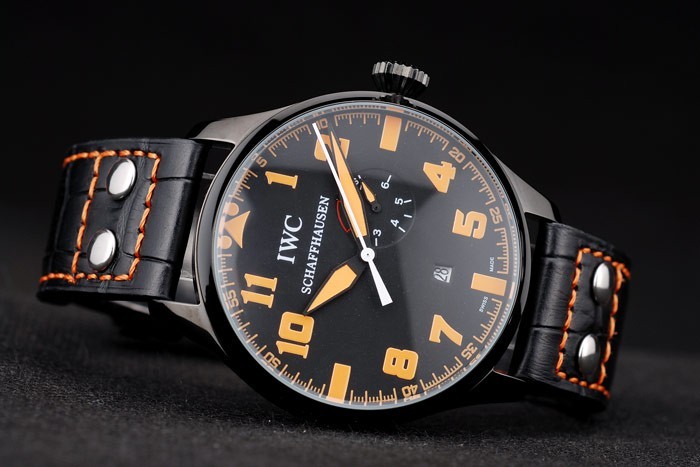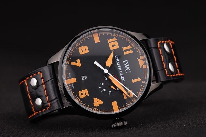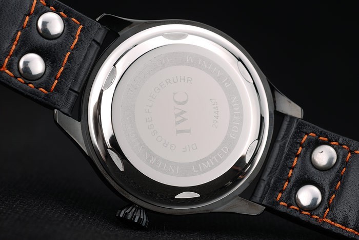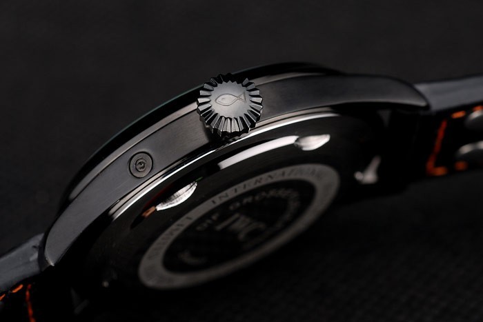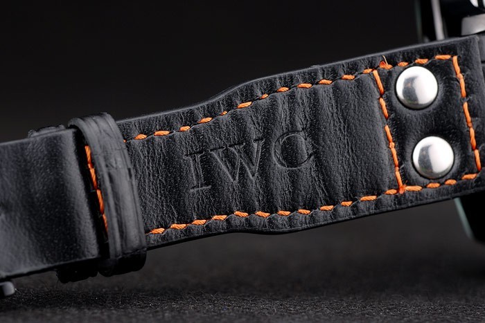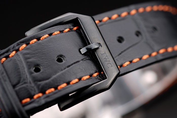 Bracelet: IWC heat embossed black crocodile leather strap with orange stitching thread and IWC engraved ion-plated stainless steel hook-buckle clasp