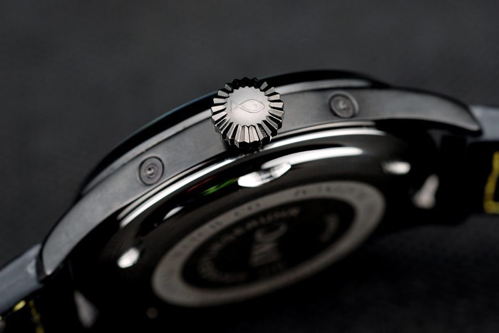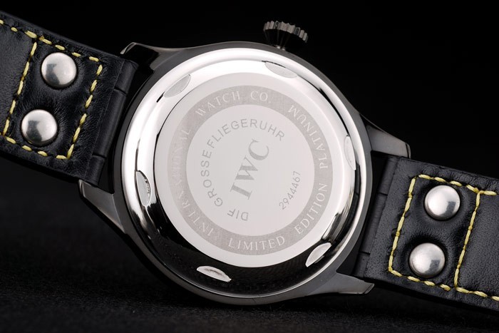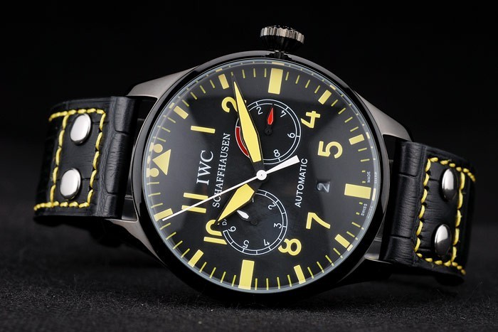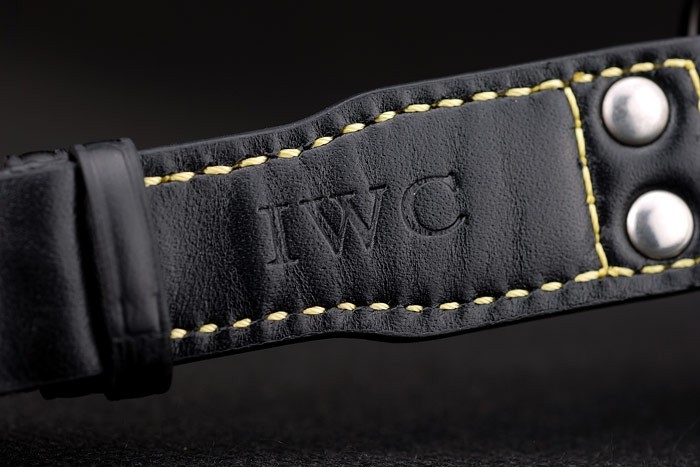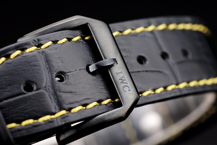 Bracelet: IWC heat embossed black crocodile leather strap with yellow stitching thread and IWC engraved ion-plated stainless steel hook-buckle clasp
