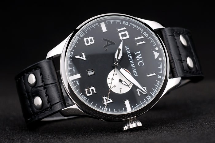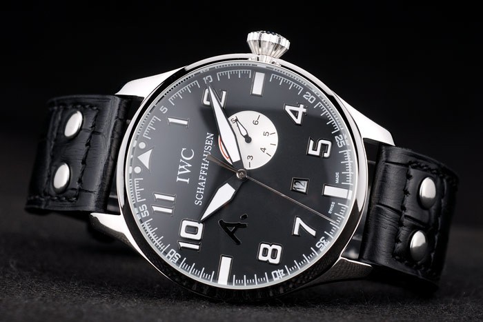 Bracelet: IWC heat embossed black crocodile leather strap with IWC engraved brushed stainless steel hook-buckle clasp