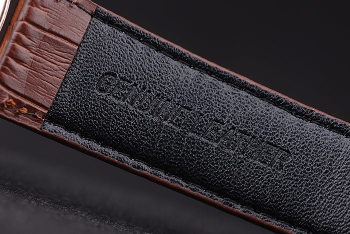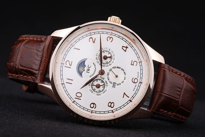 Bracelet: Brown crocodile leather strap with IWC inscribed rose-gold hook-buckle clasp