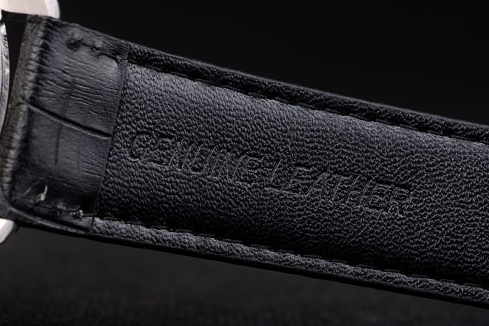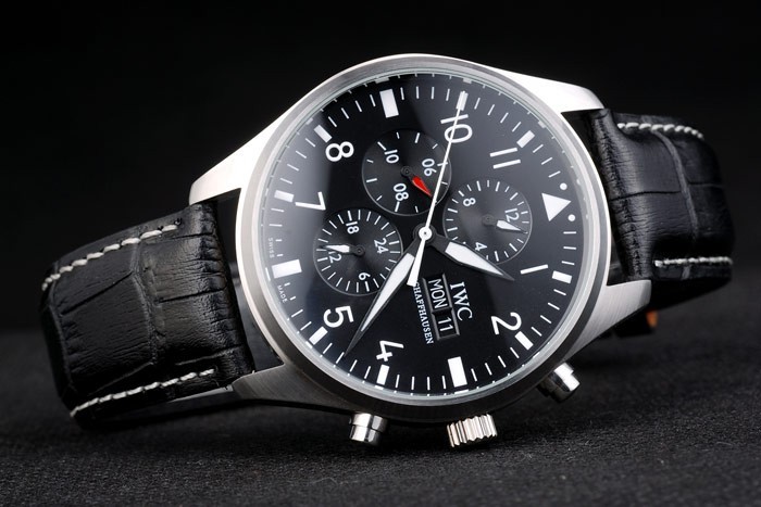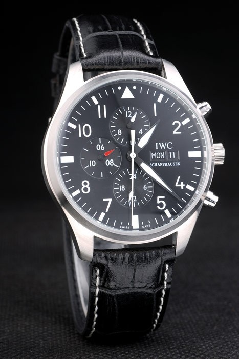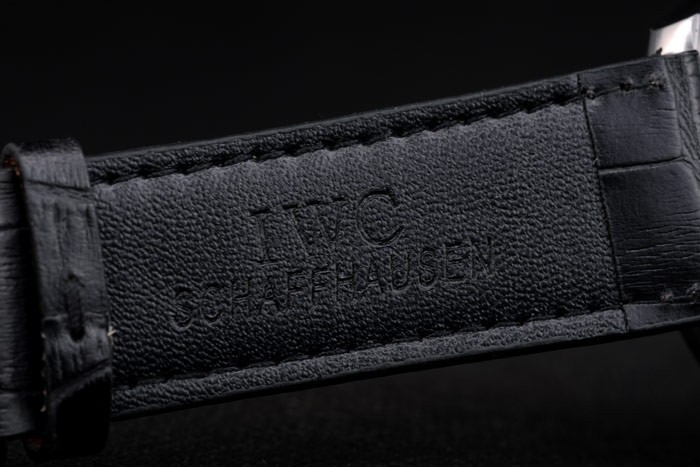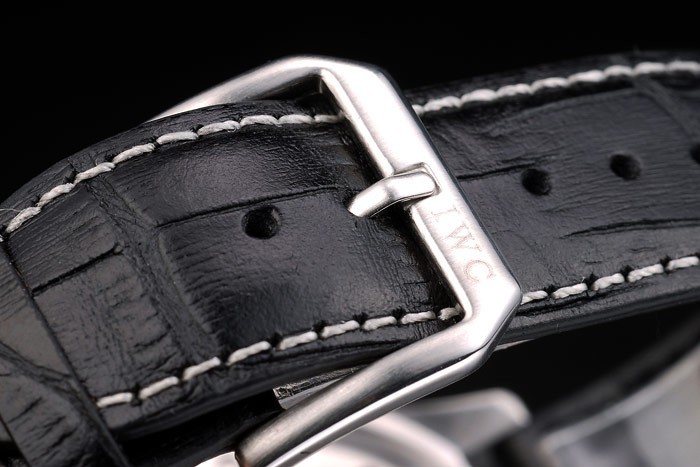 Bracelet: IWC Schaffhausen heat embossed black crocodile leather strap with white thread stitching and IWC inscribed stainless steel hook-buckle clasp