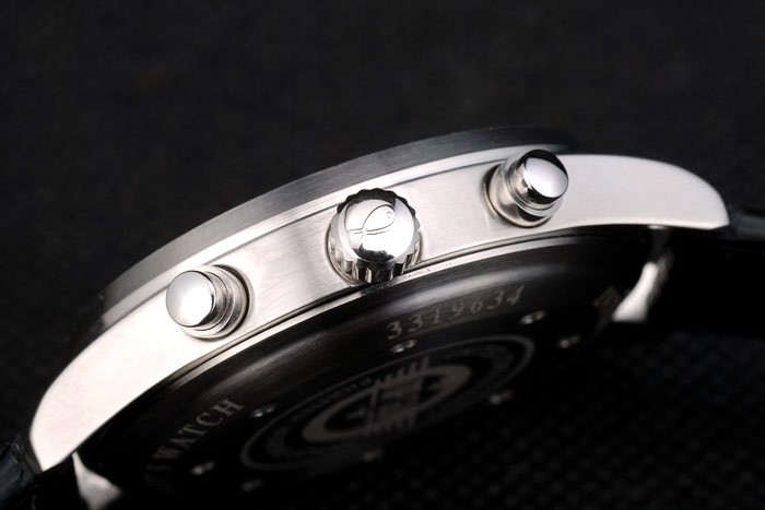 Crown: Polished stainless steel cutwork crown with IWC logo engraving and two smaller round push-button crowns on either side of it