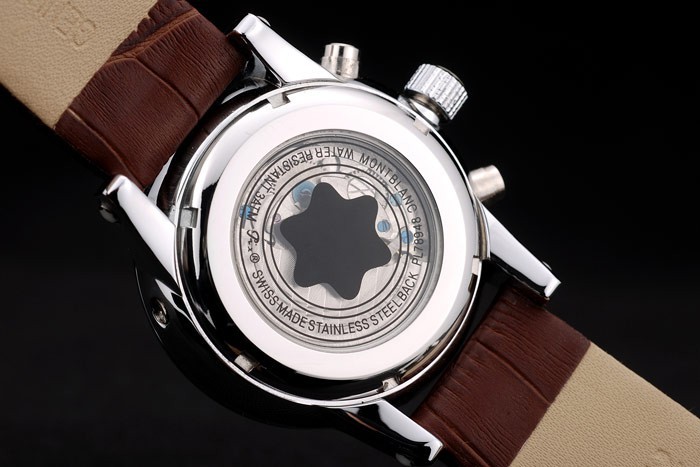 Crown: Polished stainless steel cutwork crown with MontBlanc logo and two polished stainless steel push button crowns on either side of it