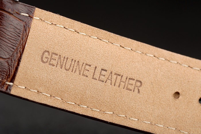 Bracelet: MontBlanc heat embossed brown crocodile leather strap with MontBlanc logo inscribed and polished stainless steel hidden hook clasp