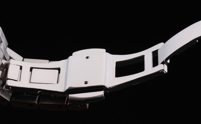 Bracelet: Rose-gold plated and brushed stainless steel link bracelet with push-button release hidden clasp