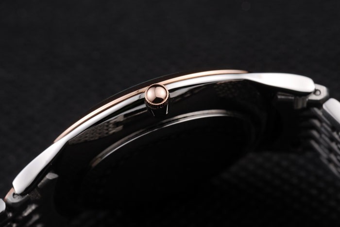 Bracelet: Finely linked rose-gold and polished stainless steel bracelet with ‘P’ engraved slide-open hidden clasp