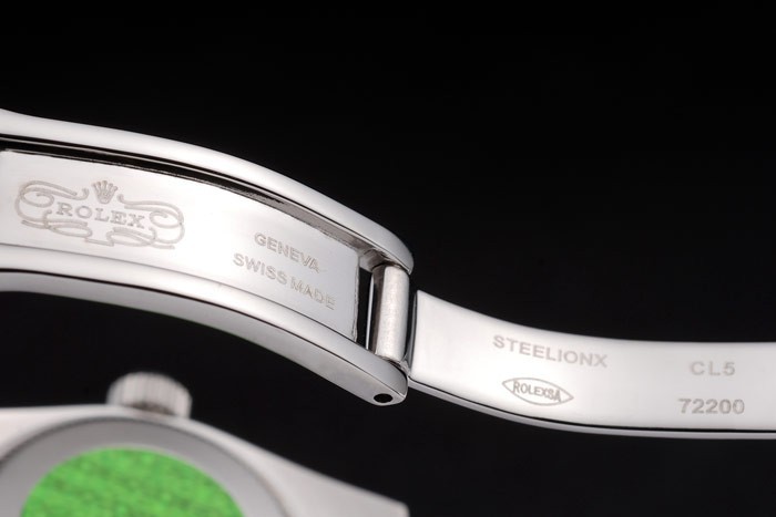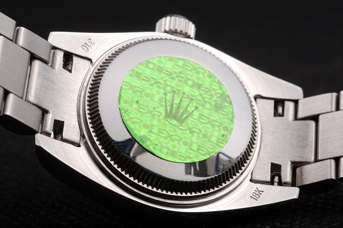 Back: Stainless steel push-in case back with green Rolex logo stamp