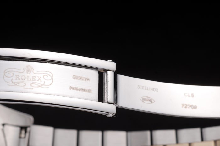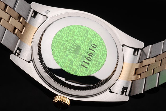 Back: Stainless steel push-in case back with green Rolex logo stamp