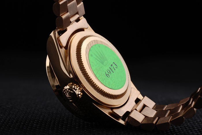 Back: 18k yellow gold plated stainless steel push-in case back with green Rolex logo stamp