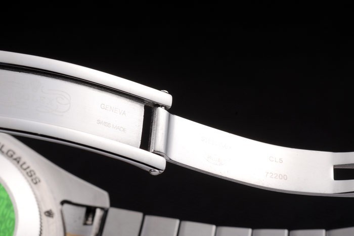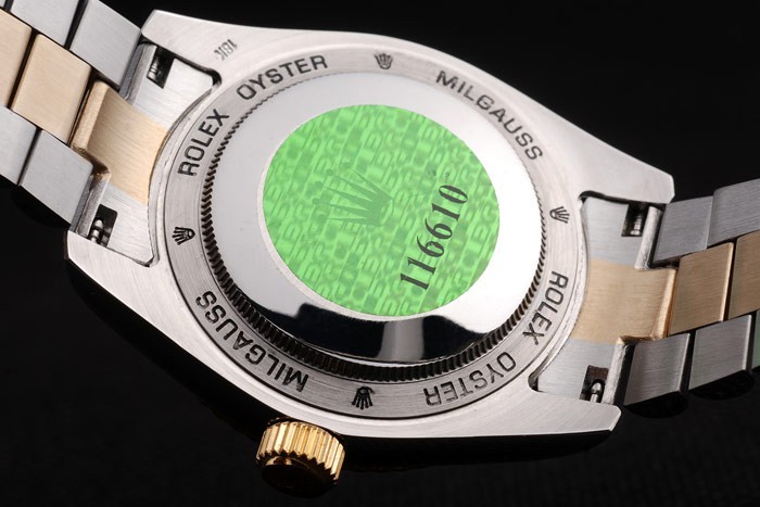 Back: Stainless steel push-in case back with green Rolex logo stamp and Rolex Oyster Milgauss engraving