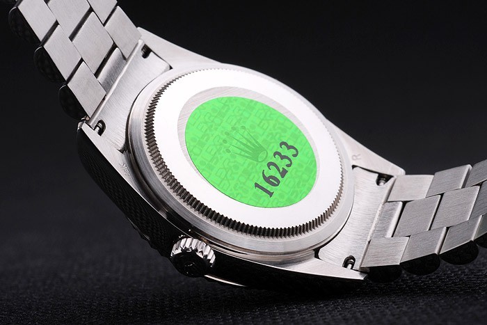 Back: Stainless steel push-in case back with green Rolex logo stamp