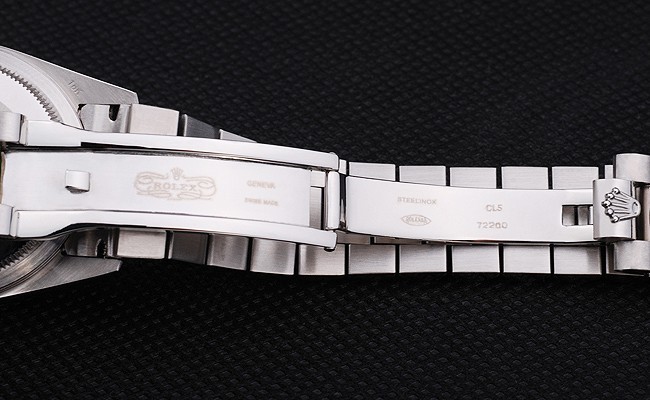 Bracelet: Brushed and polished stainless steel link bracelet with Rolex engraving hidden clasp displaying the Rolex logo
