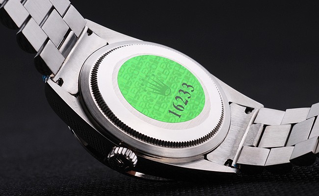 Back: Stainless steel push-in case back with green Rolex logo stamp