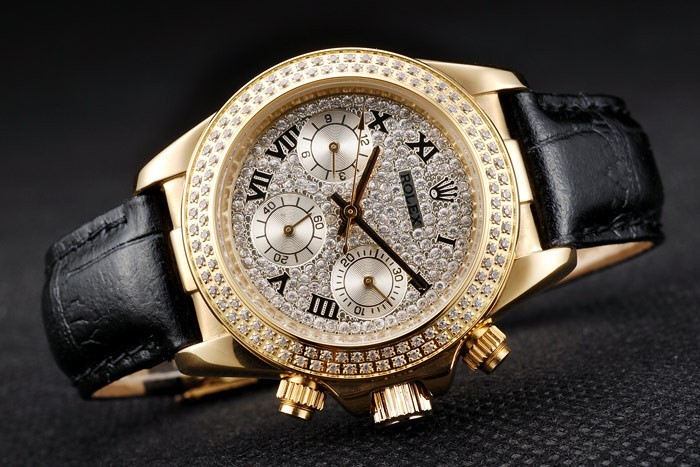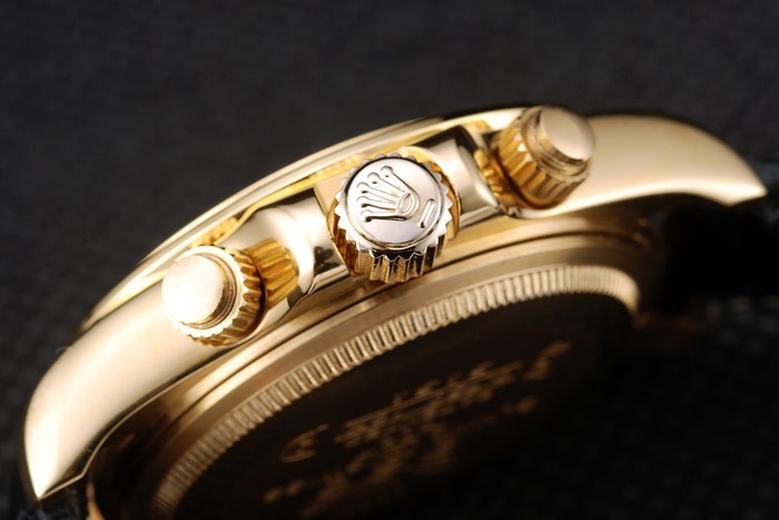 Crown: 18k yellow gold cutwork crown with Rolex logo and two smaller cutwork push button crowns on either side of it