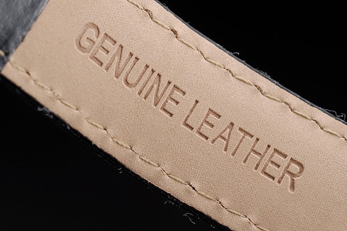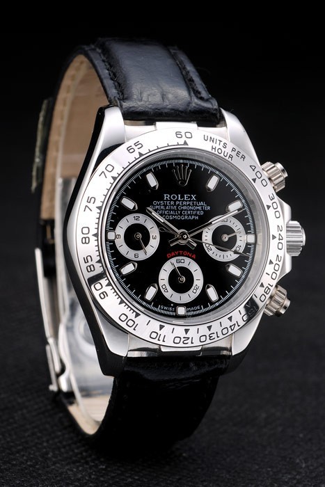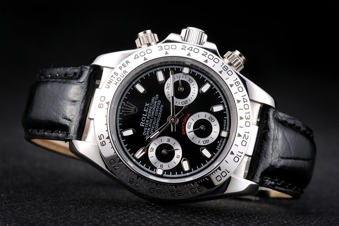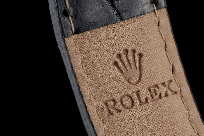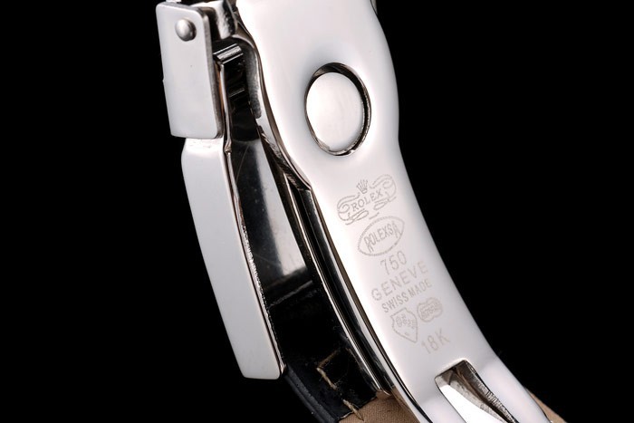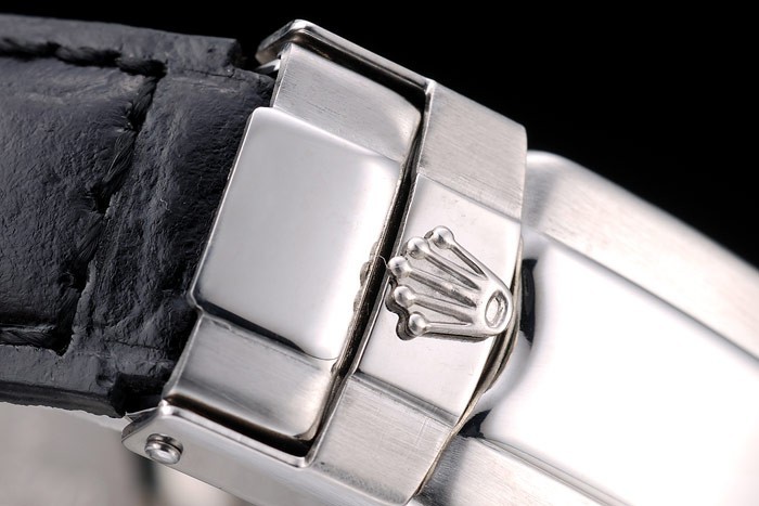 Bracelet: Rolex heat embossed black crocodile leather strap with engraved stainless steel deployment clasp with Rolex logo on top