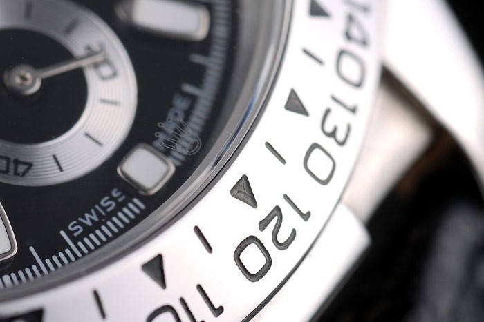Crown: Polished stainless steel cutwork crown with Rolex logo and two smaller cutwork push button crowns on either side of it