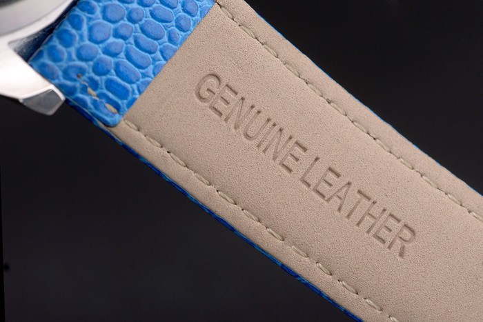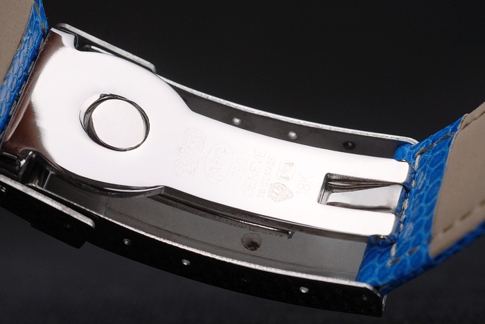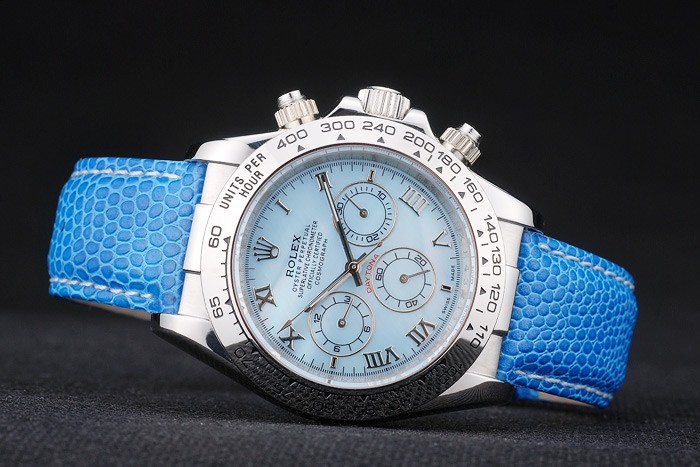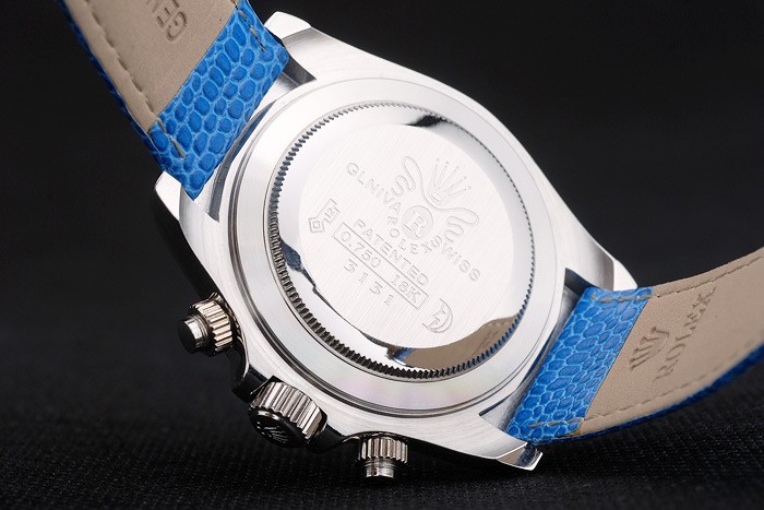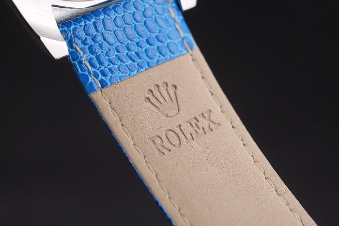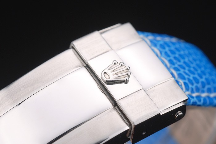 Bracelet: Blue snake leather strap with Rolex and logo engraving and stainless steel deployment clasp displaying Rolex logo