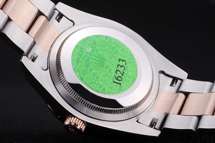 Back: Stainless steel snap-in back with green Rolex authenticity sticker