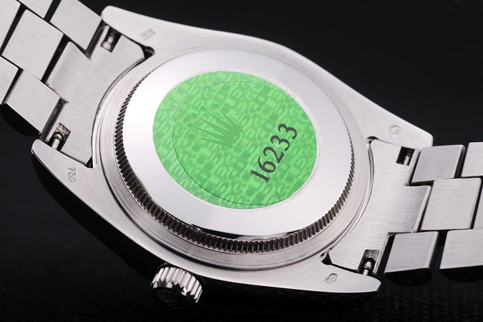 Back: Stainless steel snap-in back with green Rolex authenticity sticker
