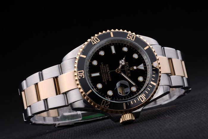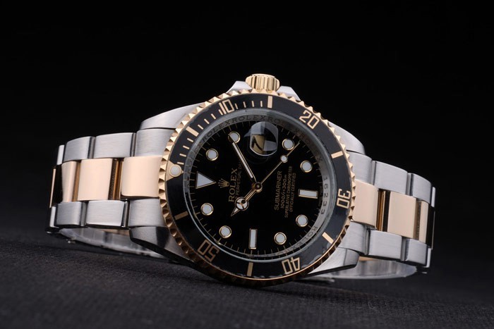 Bracelet: Two toned brushed and gold tone stainless steel link bracelet with Rolex engraving fold in clasp displaying the Rolex logo
