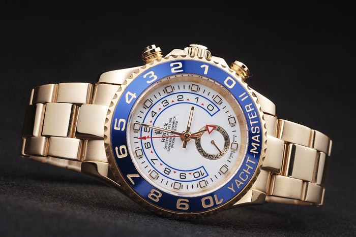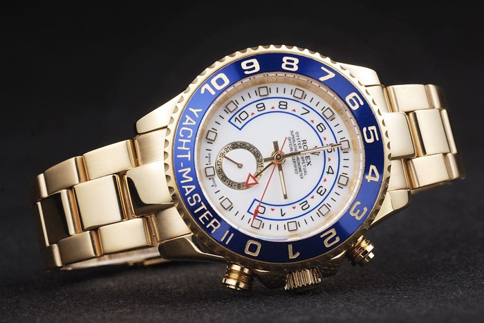 Bezel: Yellow gold plated unidirectional cutwork bezel with 1 to 10 markings and Yacht Master engraving on a blue enameled background