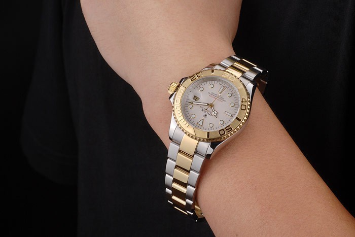 Bracelet: Two toned brushed and gold tone stainless steel link bracelet with Rolex engraving fold in clasp displaying the Rolex logo
