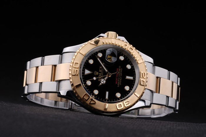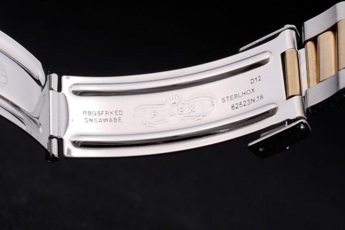 Bracelet: Two toned brushed and gold tone stainless steel link bracelet with Rolex engraving fold in clasp displaying the Rolex logo
