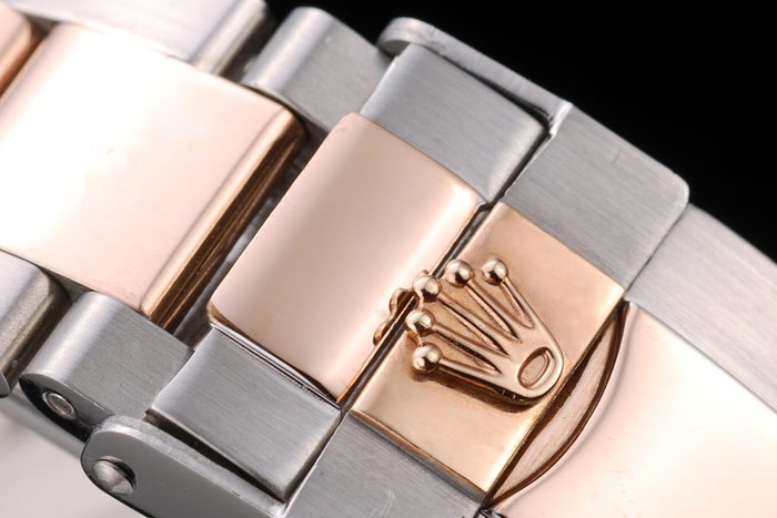 Crown: 18k rose-gold cutwork crown with Rolex logo and two smaller cutwork push button crowns on either side of it