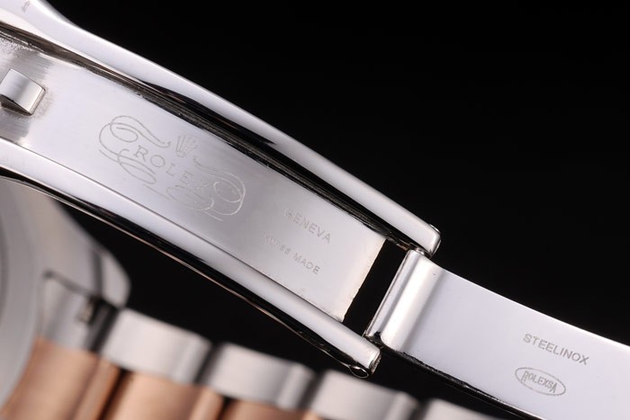 Bracelet: Rose-gold plated and brushed stainless steel link bracelet with engraved deployment clasp with Rolex logo on top