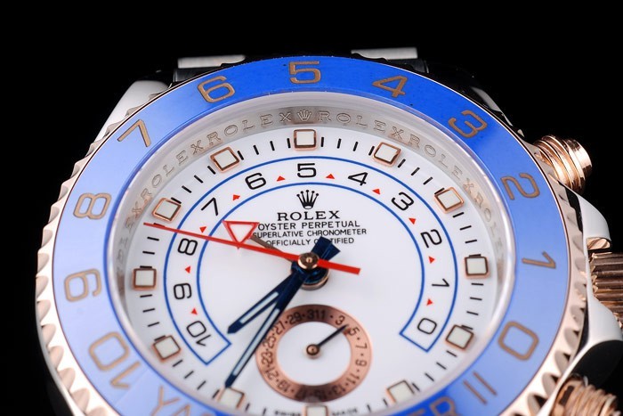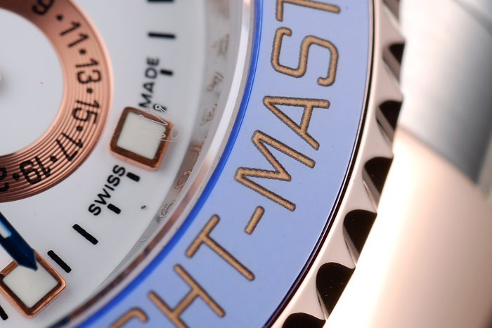 Bezel: Unidirectional cutwork blue ceramic bezel with engraved rose-gold hour markers