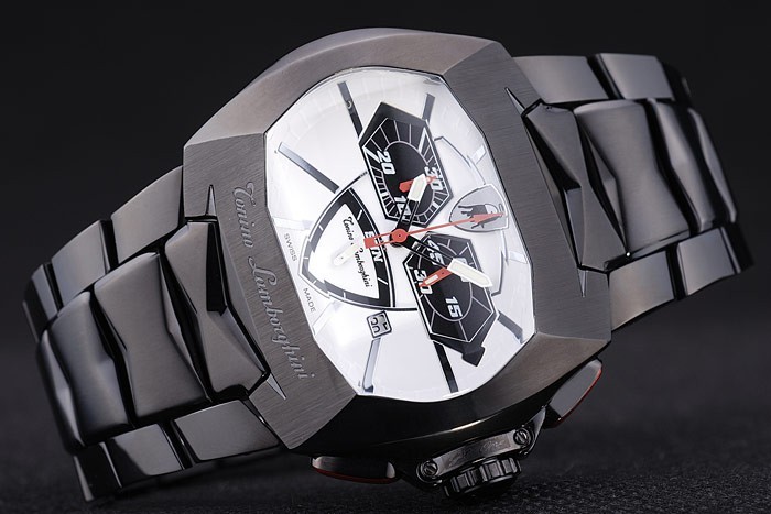 Crown: Ion-plated stainless steel cutwork crown with Tonino Lamborghini logo and two red enamel topped oblong push-button crowns on either side of it